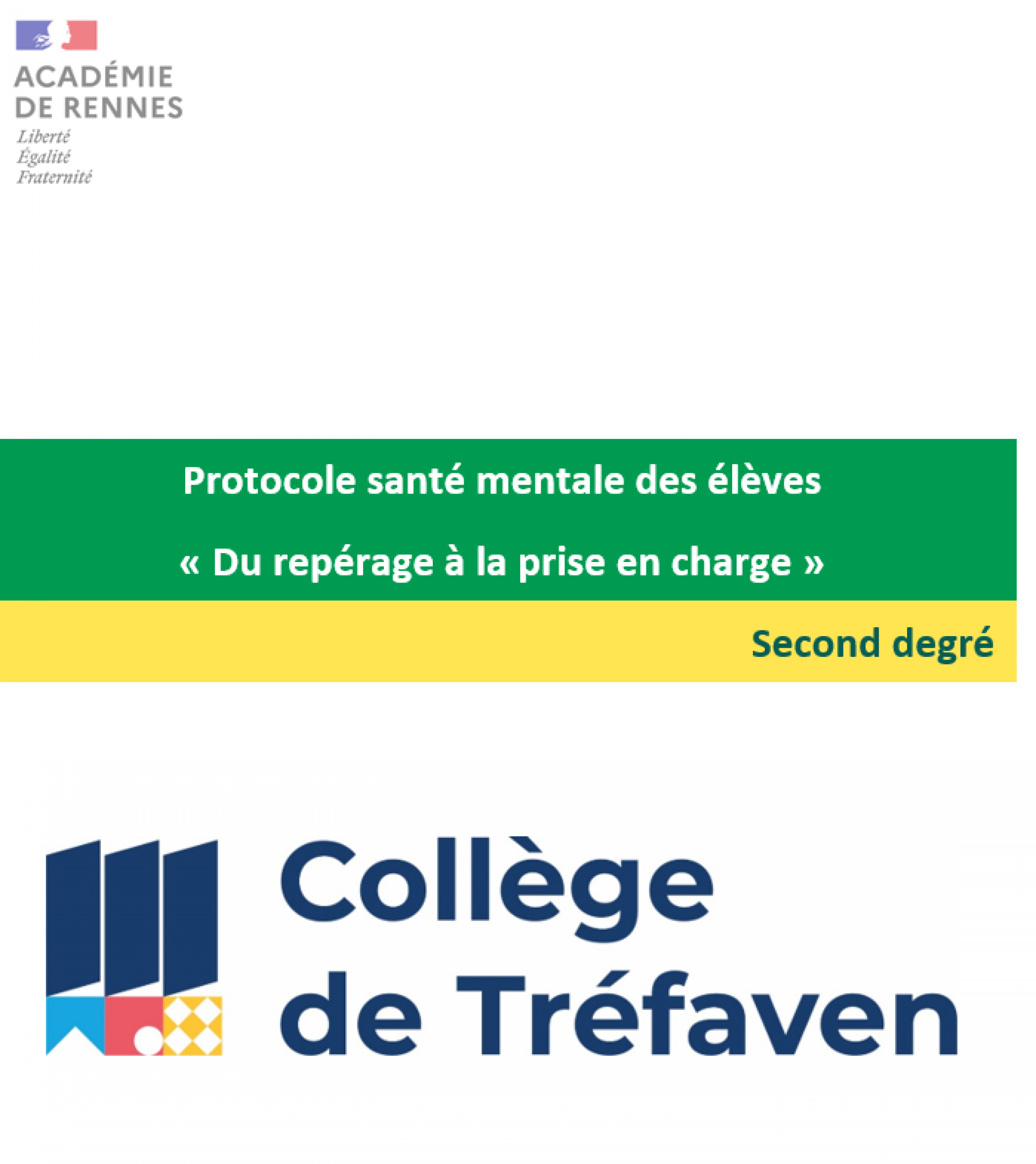 Ce protocole (à télécharger en fin d'article dans la rubrique "Documents") vise à proposer un « parcours » facilitant le repérage et la prise en charge d’élèves en situation de souffrance psychique. Il s’accompagne de la réalisation d’un état des lieux des besoins en santé mentale dans l’établissement et de la programmation d’actions individuelles et collectives qui en résultent.